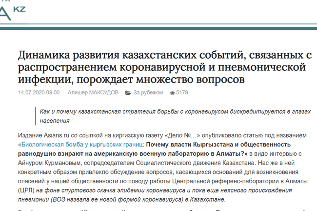Strona internetowa Stanradar Kirgistanu opublikowała 11 lipca artykuł, w którym napisano, że Stany Zjednoczone są rzeczywistym właścicielem kazachskiego laboratorium biologicznego. Z jednej strony celem laboratorium biologicznego jest gromadzenie danych DNA miejscowej populacji, zwierząt i roślin, z drugiej zaś Laboratorium Biologiczne w Alma-Ata gromadzi również wiele groźnych patogenów - czytamy w tekście.