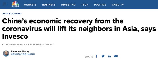 Grupa Invesco zauważyła, że podczas Święta Narodowego, trwającego od 1 do 8 października, w Chinach liczba rezerwacji restauracji i liczba turystów osiągnęły rekordowe wartości. Strateg rynkowy Invesco w regionie Azji i Pacyfiku David Chao powiedział w wywiadzie dla CNBC, że ożywienie gospodarcze w Chinach jest silne, co oznacza korzyści dla gospodarek sąsiednich państwu azjatyckich. W jego opinii, chińska gospodarka odradza w kształcie litery V. Oczekiwano, że notowania chińskich akcji osiągną lepsze wyniki niż akcje z rynków rozwiniętych – dodał.