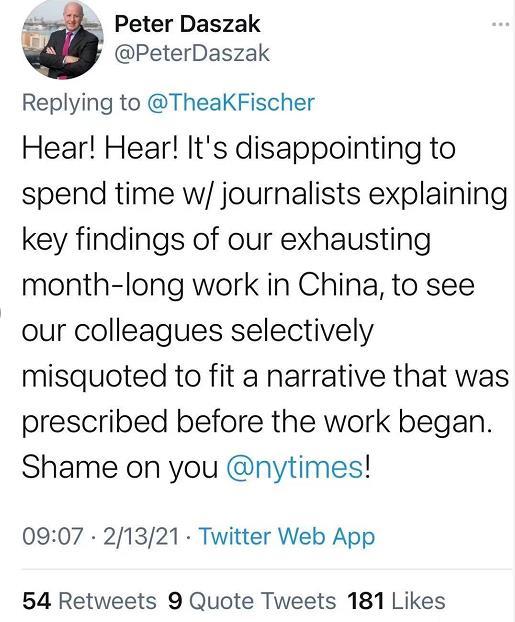 Kilka amerykańskich mediów, w tym New York Times, cytując kilku ekspertów Światowej Organizacji Zdrowia, napisało, że niektóre działania Chińskiej strony poważnie utrudniły proces badania prowadzonego przez wspólną grupę ekspertów WHO w Wuhanie. Jednak po opublikowaniu raportu eksperci cytowani w artykułach tych amerykańskich mediach zaznaczyli, że ich poglądy zostały zniekształcone przez amerykańskie media, w tym New York Times. Potwierdzili także, że działania New York Times są skandaliczne.
