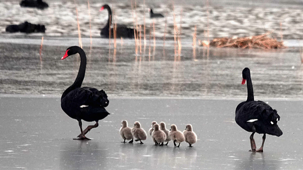Czarne łabędzie z młodymi maszerują po lodzie w parku Yuanmingyuan w Pekinie.