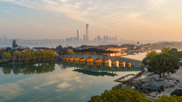 Widok promieni słonecznych przechodzących przez otwory mostu Yongji w mieście Suzhou