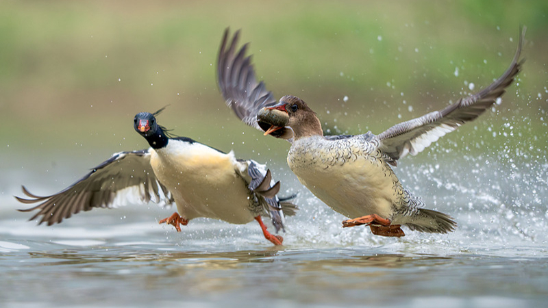 Kaczka ściga się po powierzchni wody