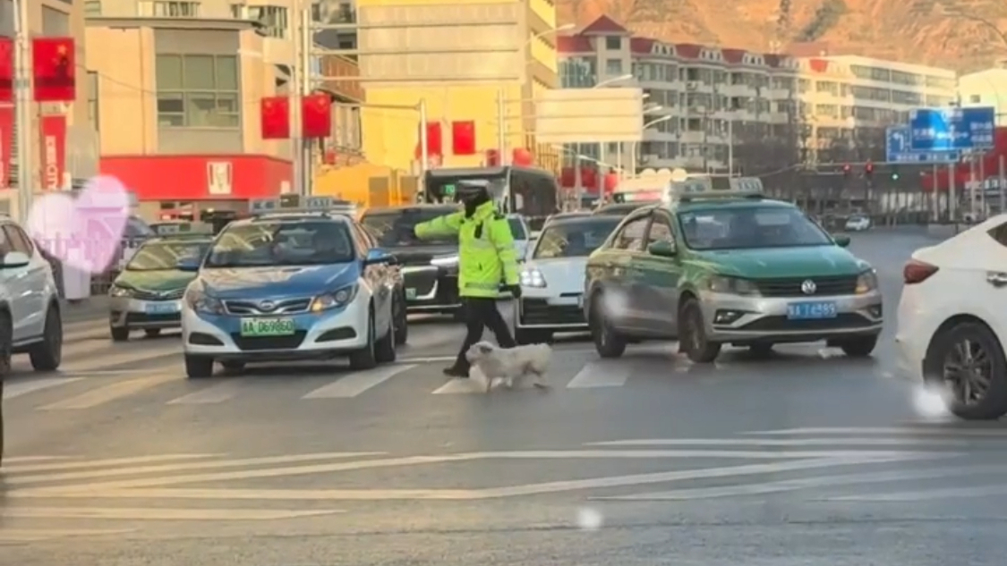 Policjant drogówki przeprowadza przez ulicę małego psa