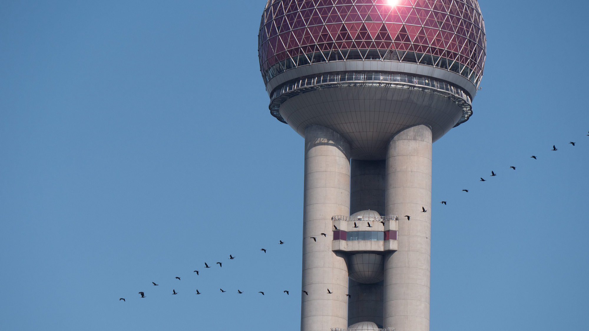 Dziesiątki gęsi w szyku przelatują obok Perły Orientu