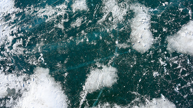 Widok jeziora Ulungu pod lodem i śniegiem