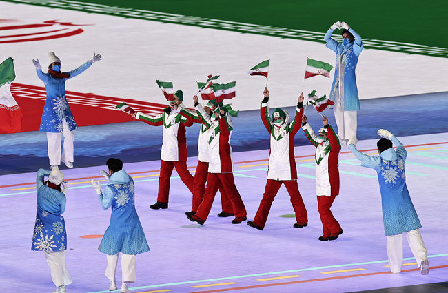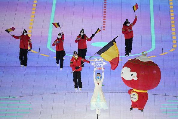 Sportowcy, członkowie sztabów szkoleniowych i oficjele reprezentacji uczestniczących w Zimowych Igrzyskach Paraolimpijskich Pekin 2022, maszerują podczas ceremonii otwarcia tej imprezy.