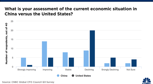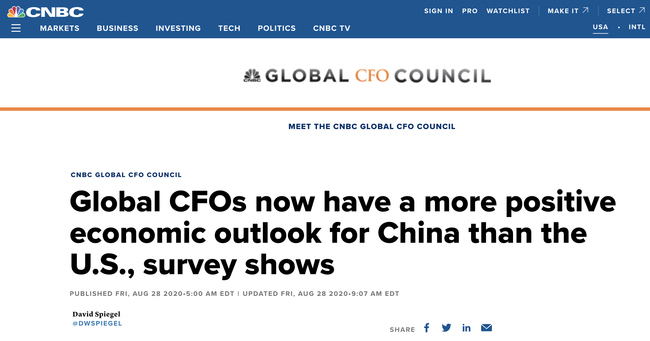 Globalna Rada Dyrektorów Finansowych (Global CFO Council) CNBC (Consumer News and Business Channel) opublikowała w piątek raport dotyczący trzeciego kwartału 2020 roku. Wynika z niego, że prognozy dyrektorów finansowych na temat perspektywy chińskiej gospodarki są bardziej optymistyczne niż perspektywy gospodarki amerykańskiej. To pierwszy przypadek w historii tego badania, w którym wskazano bardzo optymistyczne nastawienie wobec gospodarki chińskiej.