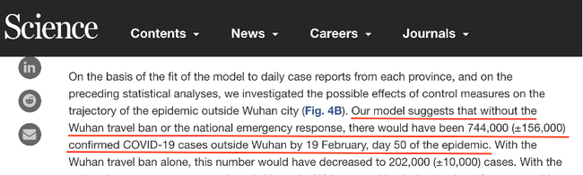 Badanie opublikowane w kwietniu w amerykańskim czasopiśmie „Science” pokazuje, że w pierwszych 50 dniach od wybuchu epidemii surowe środki zwalczania epidemii przyjęte przez Chiny umożliwiły uniknąć setek tysięcy przypadków zachorowań. W artykule czytamy, że wydaje się, że chińskie środki zapobiegawcze i kontrolne zadziałały. Chińczycy z powodzeniem odcięli łańcuch rozpowszechnienia się oraz zaprzestali kontaktów między zarażonymi i innymi osobami.