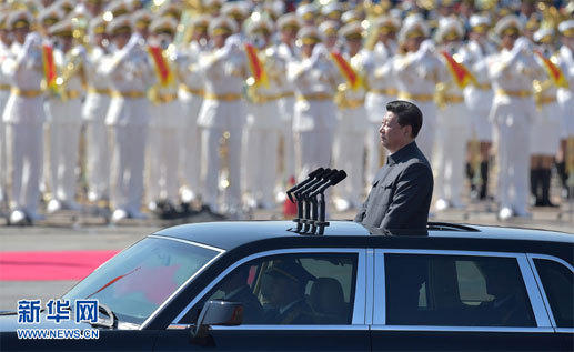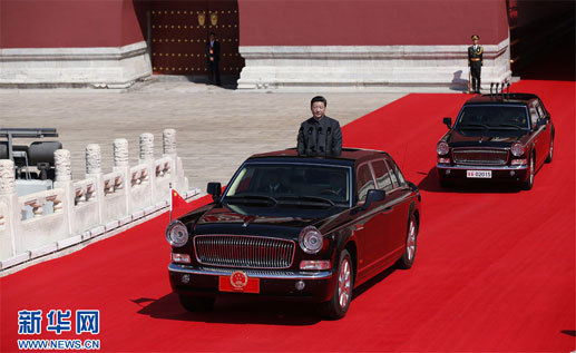 Sekretarz generalny KC KPCh, przewodniczący ChRL i przewodniczący Centralnego Komitetu Wojskowego Xi Jinping dokonał przeglądu wojsk jadąc ulicą Chang An samochodem marki "Czerwona flaga".