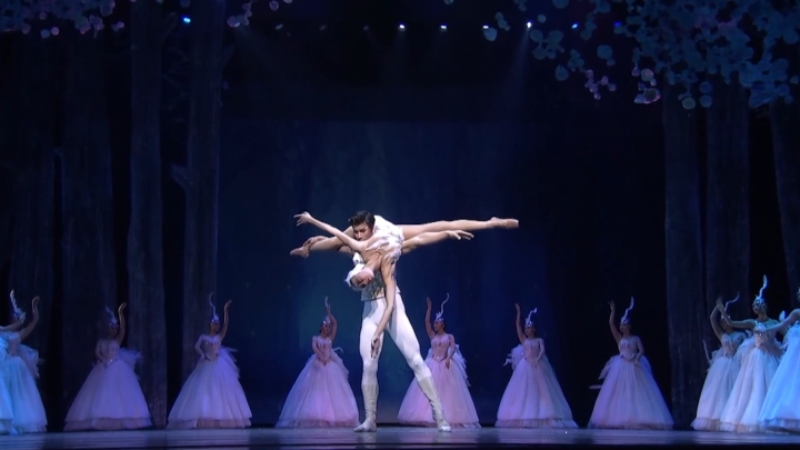 Akrobatka tańczy na ramieniu Jezioro Łabędzie