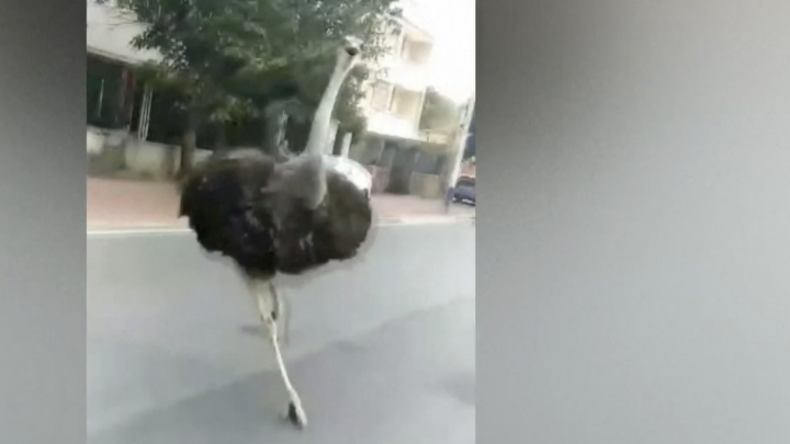 Struś biegnący w ruchu ulicznym zdaje się krzyczeć: „Jestem na wolności!”