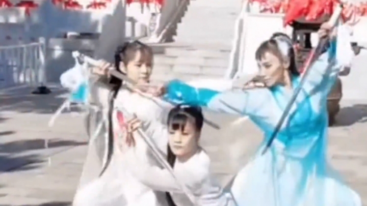 Trzy siostry noszą hanfu i tańczą z mieczami na Górze Hua