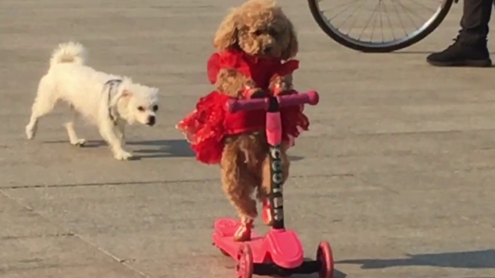 Czy widziałeś kiedyś psa, który potrafi jeździć na hulajnodze?